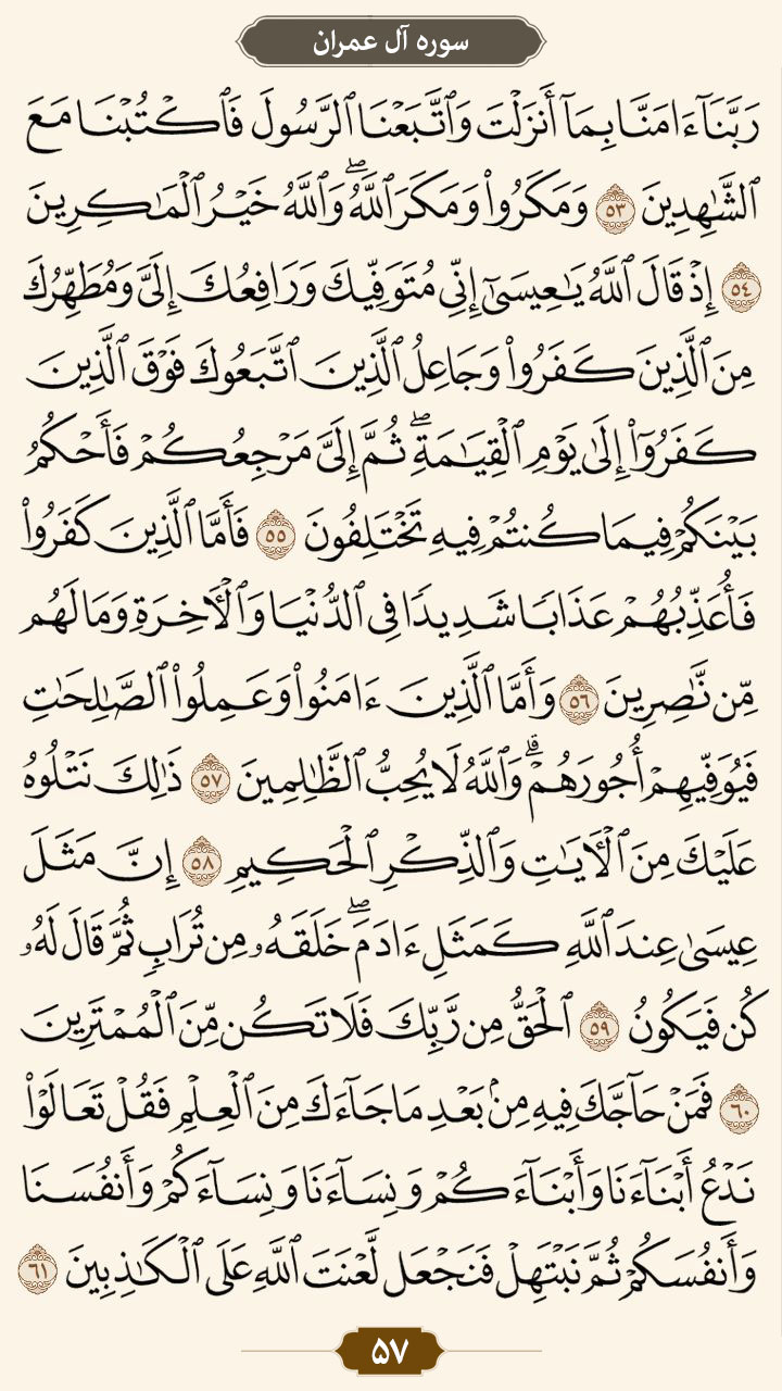 به گزارش پایگاه خبری تحلیلی «نخل و نور»؛ ترتیل صفحه ۵۷ قرآن سوره مبارکه آل عمران را بخوانید.